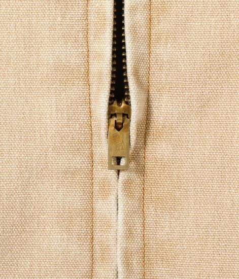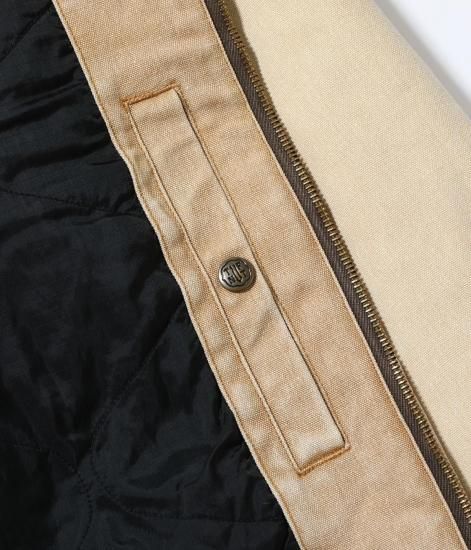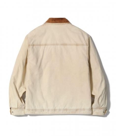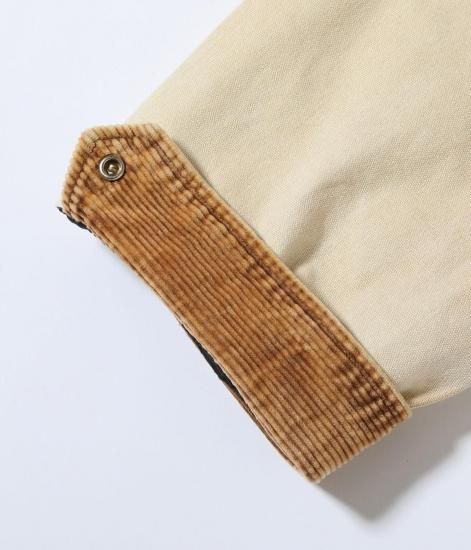 身頃に12.5オンスのコットンダック、襟とカフス裏に9ウェルのコーデュロイを使用したワークジャケット。裏地にキルティング生地を使用しており、袖口は2つのボタンで調整可能。特殊な加工を施したエイジングモデルは襟元のコーデュロイの褪色も魅力。頑丈な生地とタフな縫製仕様はデイリーユースに最適。
