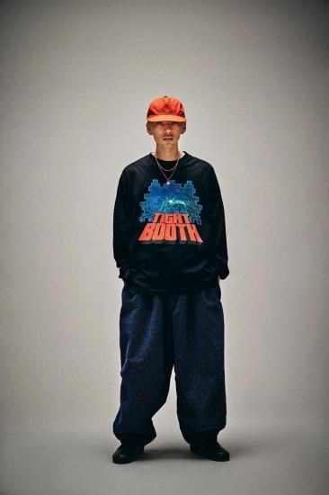 色違いの糸が折り込まれ、ドットのように見える太畝コーデュロイ生地を使用したバルーンパンツ。 裾を狭め、膝のタックで立体感とゆとりのあるシルエット。 スラッシュポケットとファスナー付きのサイドシームポケット、隠しマグネットボタン仕様のバックポケットを搭載。 ゴム入りのウエストバンドはベルトループと内出しのスピンドルコードを装備。 バックの右腰部分にはロゴ入りパッチ付きで、ウエストボタンもロゴ入りパーツを使用。 ウエスト ワタリ 前股上 股下 裾幅 M 72 / 100 45 35 68 21 L 78 / 106 48 36 69 22 XL 84 / 112 51 37 70 23 「TBPR」 日本から全国、世界へ向けて発信される スケートボードプロダクション。 2005年に「BRANDNEW CLASSIX」を2006年に「FINDERSCREEPARES」、 2007年に「DIALOGUE BETWEEN INSIDERS」をリリース。 2009年代表作となる「LENZ」をリリースする。 2013年には総勢180人を超えるスケーターが出演した続編「LENZII」をリリースし、日本全国に留まらず ニューヨーク、ロサンゼルス、デトロイト、パリ、ボルドー、ベルリン、バレンシア等、 世界中で試写会を開催。 スケートビデオ制作にとどまらず、独自の世界観で発信するソリッドなアパレルラインや、 スケートボードを中心としたカルチャーマガジン「ER」を発刊。 |